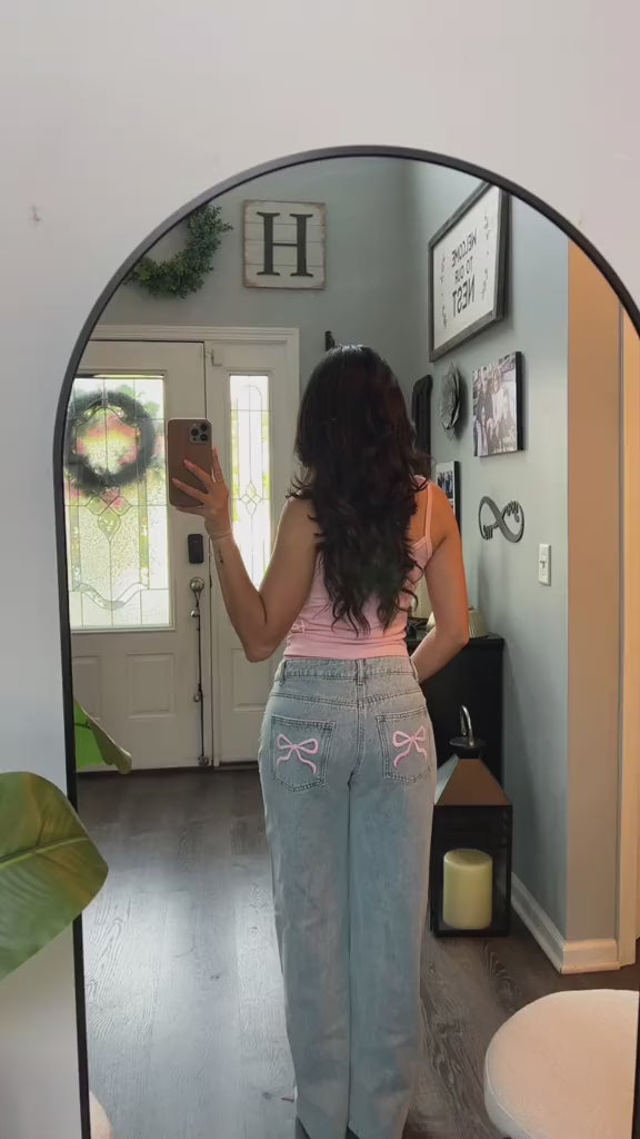 Oppgrader garderoben din med denne unike wide-leg denimjeansen. Den løse passformen og de iøynefallende sløyfedetaljene på baklommene gjør dette plagget til et blikkfang for enhver anledning.